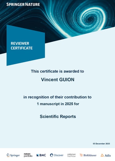 La relecture – ou peer-reviewing – d’articles scientifiques proposés par d’autres équipes de recherche avant leur publication dans des revues internationales indexées. Retrouvez ci-dessous les derniers certificats émis par les sociétés d'édition.